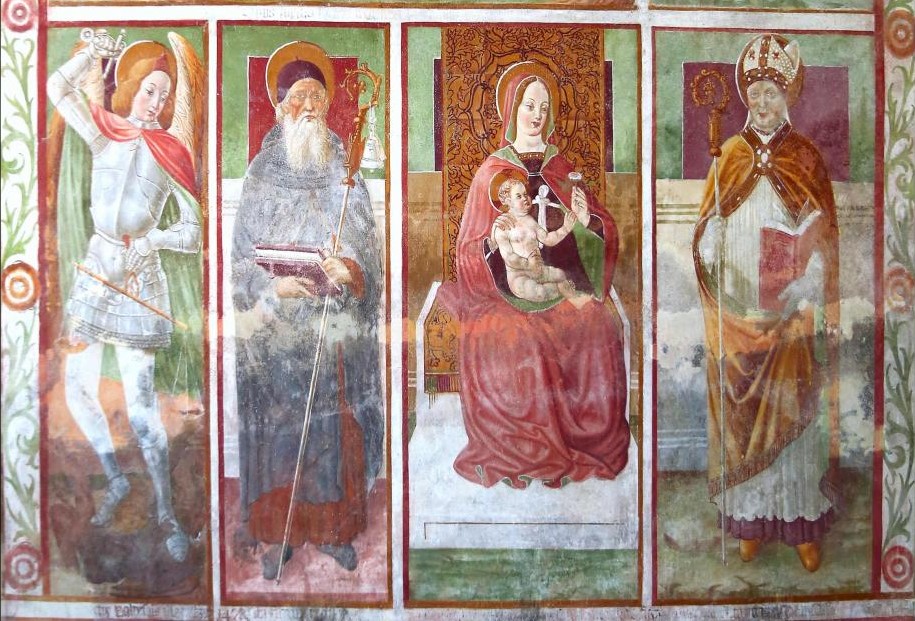 Nel registro inferiore, da sinistra, sono rappresentati san Michele nell’iconografia della pesatura delle anime; sant’Antonio abate; la Madonna in trono con il piccolo Gesù; un vescovo forse identificabile in S. Gottardo, patrono dei mercanti, dei febbricitanti e dei viandanti.
