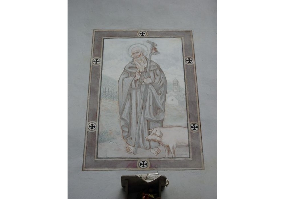 Il Santo, che indossa saio e mantello grigi, ha la mano destra in atteggiamento benedicente, e regge con la mano sinistra il bastone a forma di tau con la campanella; ai suoi piedi si trova il maialino. Sullo sfondo dell’affresco a sinistra è rappresentato un paesaggio montano con un bosco di abeti, mentre a destra si vede una chiesa con un campanile, che riproduce la parrocchia di S. Pietro Apostolo di Exilles.