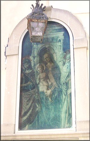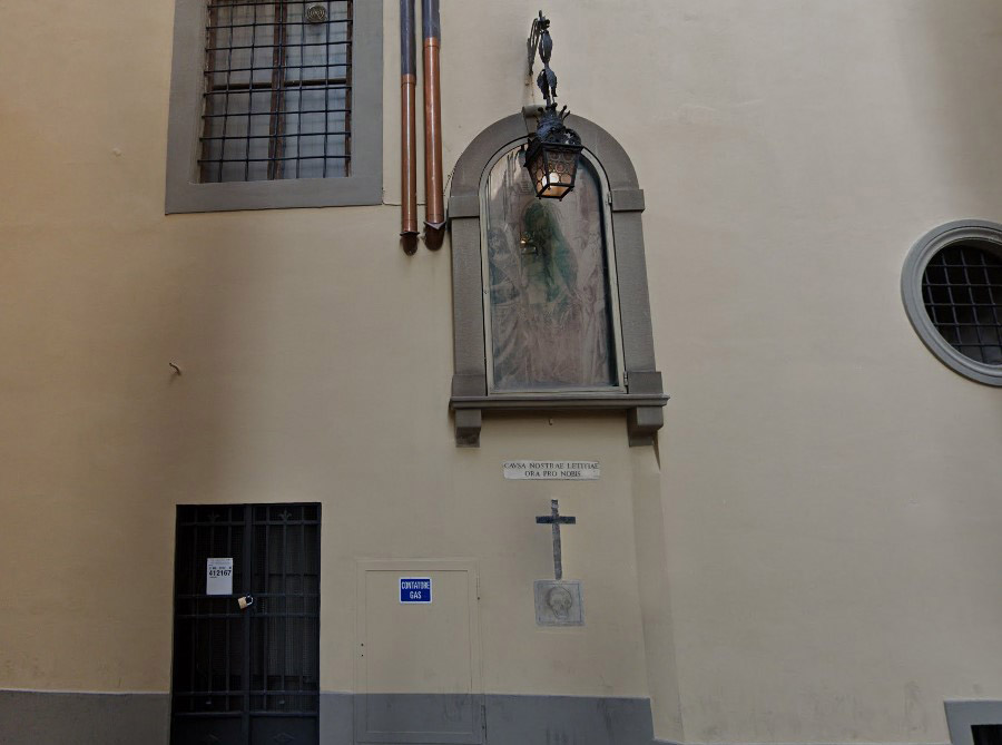 Sotto di esso si legge una lapide dedicata a Maria (“CAUSA NOSTRAE LAETITIAE / ORA PRO NOBIS”), sotto la quale è un placca in marmo bianco con un teschio (a riprendere il tema dell’antica intitolazione della strada, Via della Morte) sormontata da una croce in marmo grigio scuro. La cornice centinata nascondeva una parte dell’affresco originale, di forma rettangolare.