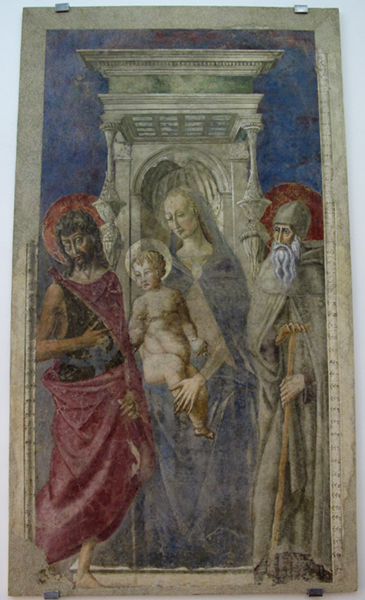 L’affresco, restaurato intorno al 1980, forse fu commissionato dagli Ufficiali dei Pupilli, o la Compagnia di Sant’Antonio abate, che si riuniva nella vicina chiesa di San Cristofano degli Adimari. Non menzionato da fonti antiche, è stato variamente attribuito: per Carocci, alla scuola di Filippino Lippi, per Roberto Longhi alla cerchia del Maestro di Pratovecchio; per Busignani al giovane Verrocchio o un artista della sua cerchia (attribuzione più accettata), per Boskovits a Domenico Botticini e per Federico Zeri a un anonimo fiorentino vicino a Piero del Pollaiolo.