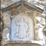 Sant’Antonio a destra, con barba bianca biforcata, saio con mantello e cappuccio, appoggia le mani su un bastone a tau.