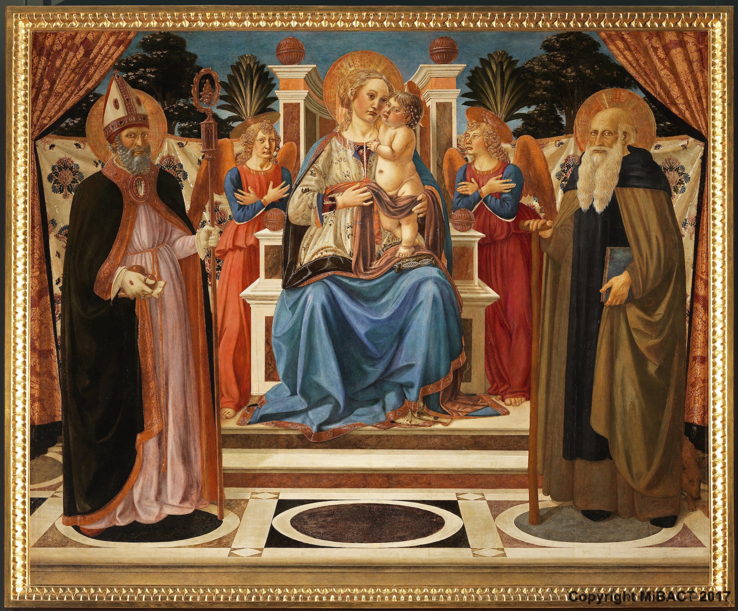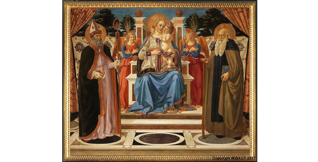 La tavola è una delle opere più antiche tra quelle note di Cosimo Rosselli, che si formò nella bottega di Neri di Bicci. Come il suo maestro, l’artista predilige modelli tradizionali e consolidati nel repertorio artistico del tempo: le cortine di stoffa che “aprono” la scena, già molto utilizzate da Alessio Baldovinetti; il pavimento marmoreo deriva da quello dipinto dal Pollaiolo per la Pala del Cardinale del Portogallo in San Miniato al Monte, di pochi anni precedente (e ora agli Uffizi); il Bambino in piedi ricorda i rilievi marmorei di Desiderio da Settignano. Nella costruzione della scena sacra, la prospettiva converge fortemente verso il centro, accentuata dalle figure in primo piano poste di tre quarti e dai pilastrini del trono, che stringono verso il fondo.
