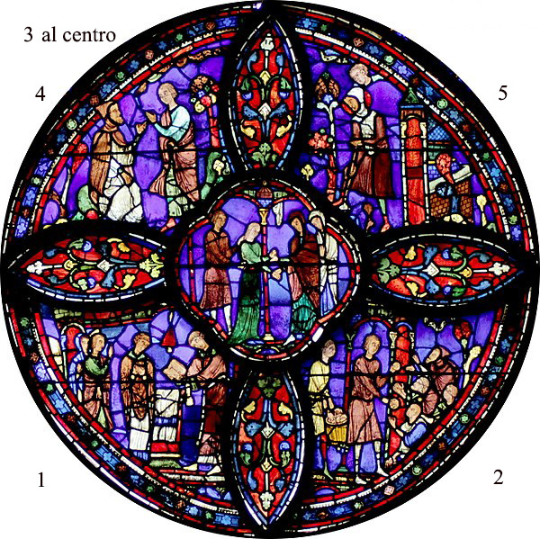 trate più importanti risalenti al XIII secolo, che presentano un colore blu particolare e inimitabile tale che è noto anche come “blu di Chartres”. Comprese le rosette, le 176 vetrate coprono una superficie di 2600 m². Raffigurano principalmente santi e personaggi biblici. Alcune vetrate del XII secolo sono ancora presenti nell’edificio, essendosi salvate dall’incendio del 1194 e sono tra le più antiche vetrate del mondo. Tutte le altre risalgono al 1215-20.