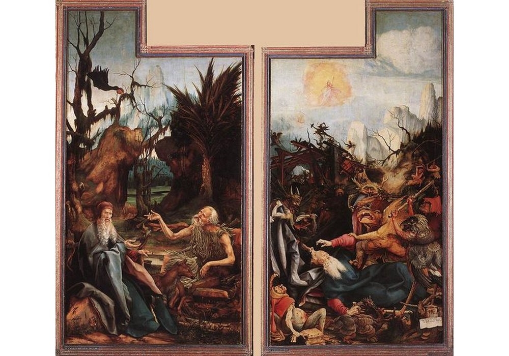 Nei due pannelli raffiguranti i santi Antonio e Paolo e le tentazioni – o meglio i tormenti – di sant’Antonio, entrambe le scene sono immerse in paesaggi impervi al quale fa da controparte, nella prima raffigurazione, la presenza di un cerbiatto, simbolo di atmosfera pacata; nel pannello di destra vi è una casa diroccata dal terremoto e i diavoli ci ballano sopra. Nelle tentazioni, il Santo viene trascinato dai demoni tra animali, strane chimere dai corpi misti, esseri immaginari che si contrappongono all’omino coperto di pustole che compare in basso, essere realistico e rappresentante di una società che vive tra guerre e pestilenze.