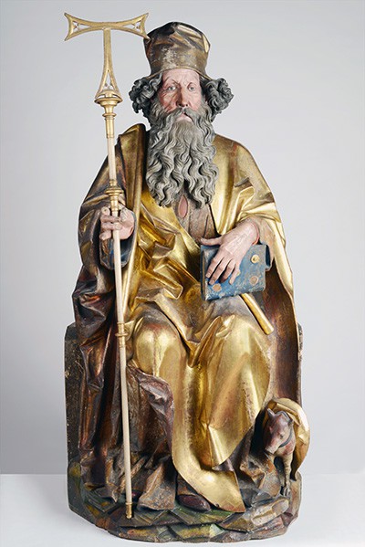 Le due ante fiancheggiano un’edicola lignea scolpita realizzata da Hagenauer che raffigura: a sinistra s. Agostino, al centro s. Antonio abate in trono, a destra s. Gerolamo; nella predella Gesù con gli Apostoli a gruppi di tre a mezzo busto.