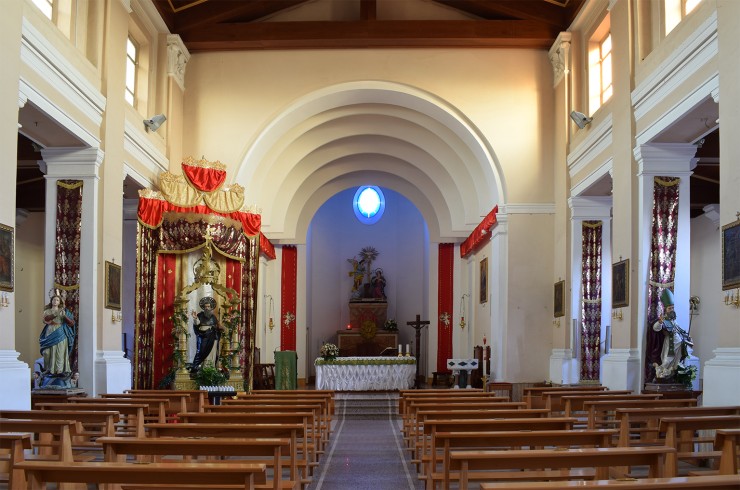 Gli spazi interni sono scanditi dal susseguirsi di colonne con base quadrangolare che sezionano la chiesa in tre navate coperte da soffitto a capriate. Gli interni sono decorati dalla presenza di numerose statue (quella dell’Annunciazione risalente al Settecento, quella della Madonna con il Bambino risalente al periodo normanno, forse appartenente alla chiesa delle Tre Croci, oggi ridotta a rudere).