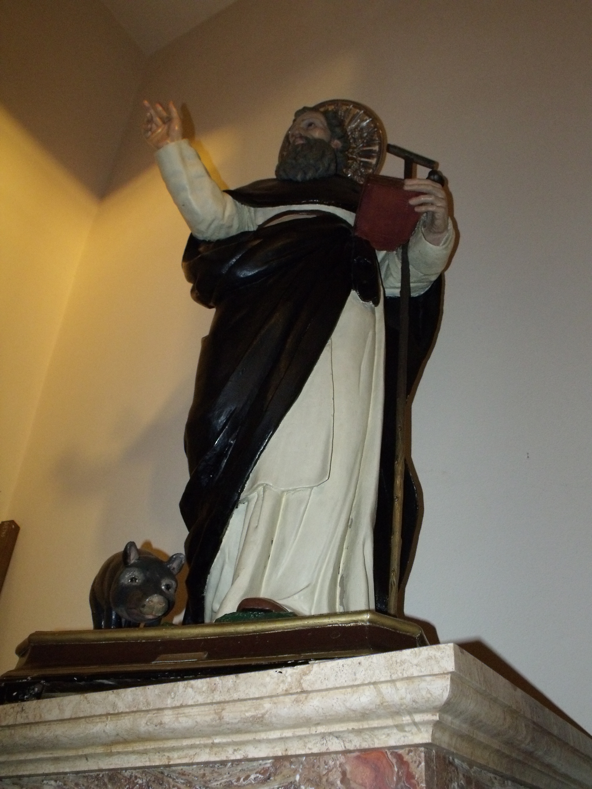 La statua di s. Antonio abate, conservata sul lato sinistro del presbiterio, presenta il Santo che indossa saio e mantello scuro, la mano destra nel gesto di benedizione e la sinistra che regge il bastone a tau cui è appesa una campanella e il libro chiuso su cui è il fuoco. Un maialino è ai suoi piedi, a sinistra