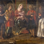 Tempera su legno di pioppo che raffigura “Madonna in trono con quattro angeli e s. Antonio abate e un Santo (con la spada).”