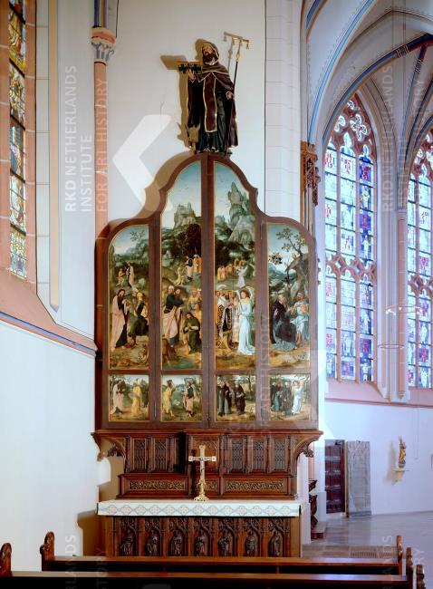 Il polittico, piuttosto grande, chiuso misura 380 x 284 cm, aveva la sua collocazione originaria nella cappella sul lato sud della torre, che separava dalla navata sud. Qui fungeva da divisorio, così come il retablo di Sant’Anna (oggi sull’altare maggiore) sull’altro lato della torre. Qualche tempo fa si è scoperto che la predella dell’altare di Antonio, realizzata nel XIX secolo, aveva un predecessore tardo medievale, originariamente associato, che è conservato nella chiesa: la predella Lamberto nella cappella battesimale. Insieme ad esso si sono conservati due pannelli con raffigurazioni di Lamberto, fissati sul retro della predella. Ciò ha reso chiaro che il complesso programma iconografico di questo altare alato si estendeva anche alla sua parte posteriore. Recentemente è stato inoltre scoperto che nel Museo Civico Kramer di Kempen sono conservati tre pannelli, che originariamente coprivano il retro della pala d’altare nella parte superiore. Mostrano il miracolo della forca di S. Giacomo, la cui vita è raffigurata sul davanti. le dimensioni corrispondono esattamente a quelle del fondo del retablo di Sant’Antonio e stilisticamente il dipinto può essere chiaramente attribuito ad Anversa. Il restante spazio libero sulla parete di fondo era coperto da tre quadri con scene della vita di sant’Antonio, in particolare le Tentazioni. Anche questi sono appesi nella cappella battesimale della chiesa.