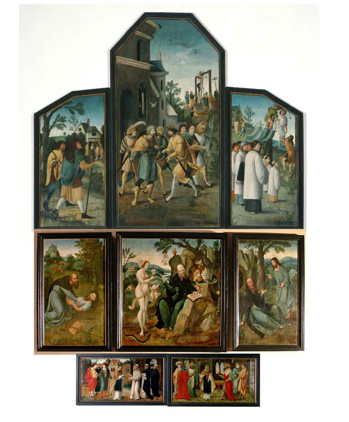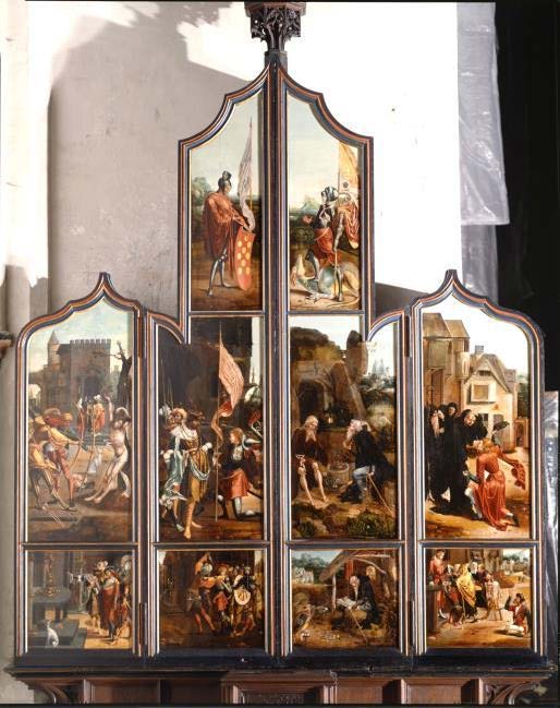 Di fronte alla parete terminale orientale della navata nord si trova il retablo a doppie ali che, aperto, raffigura “Scene della vita di Sant’Antonio abate “ (ala destra); “Scene della vita di San Sebastiano” (ala sinistra); “San Giorgio”(ala superiore sinistra); “San Lamberto” (ala superiore destra). Datato al 1520. La predella è del XIX secolo.