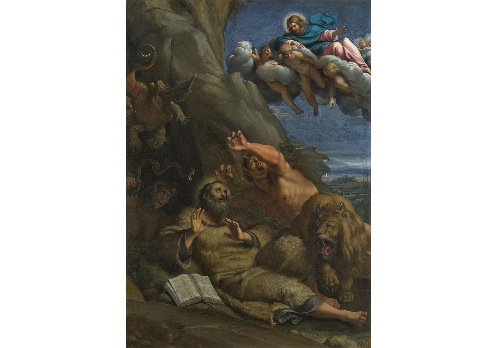 Un uomo barbuto con una veste di pelli viene violentemente minacciato da un’orda di creature demoniache. Ha messo da parte il suo libro e guarda il cielo in cerca di aiuto, dove Cristo è apparso su una nuvola.