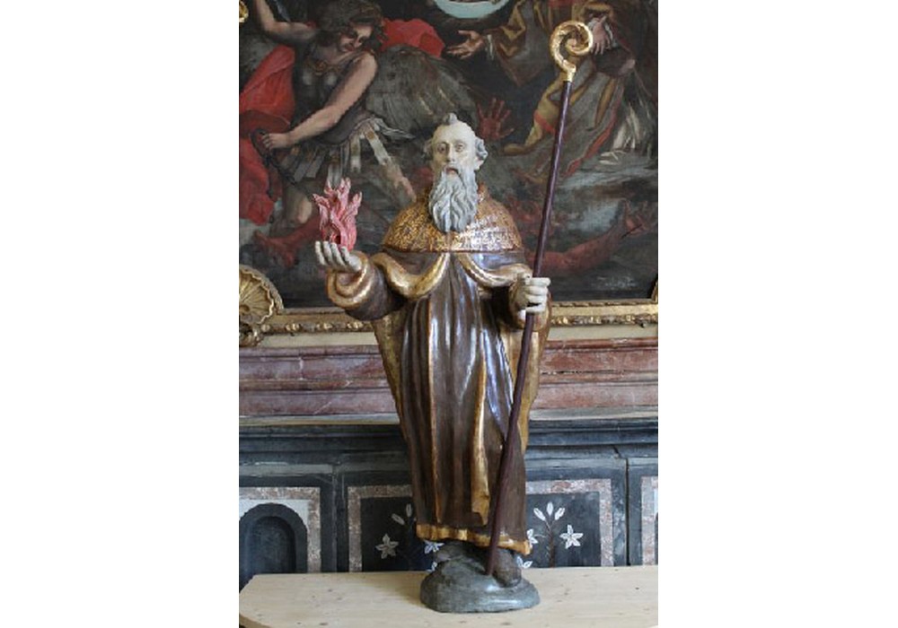 Il santo tiene nel palmo della mano destra il fuoco e nella mano sinistra il bastone episcopale.