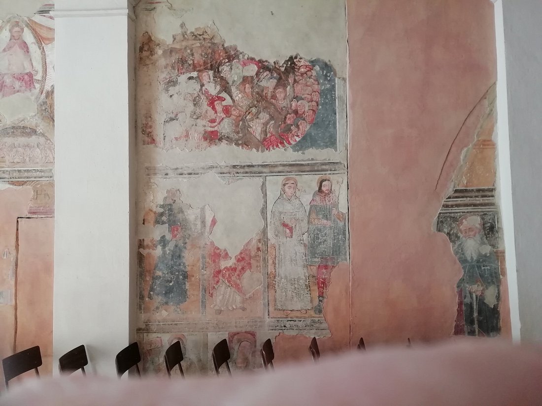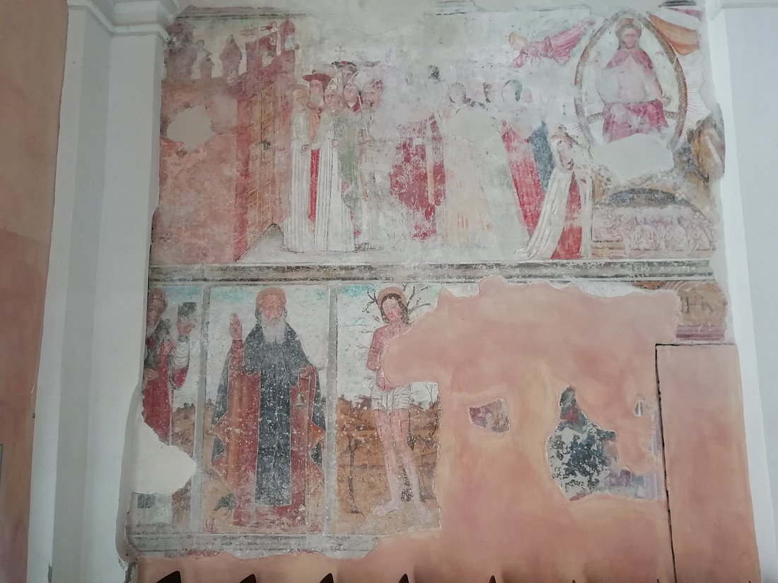 A destra del Giudizio, in basso, un’immagine frammentaria di sant’Antonio abate, con la tau sul mantello, che tiene con la mano sinistra il bastone a tau cui è appesa una campanella.