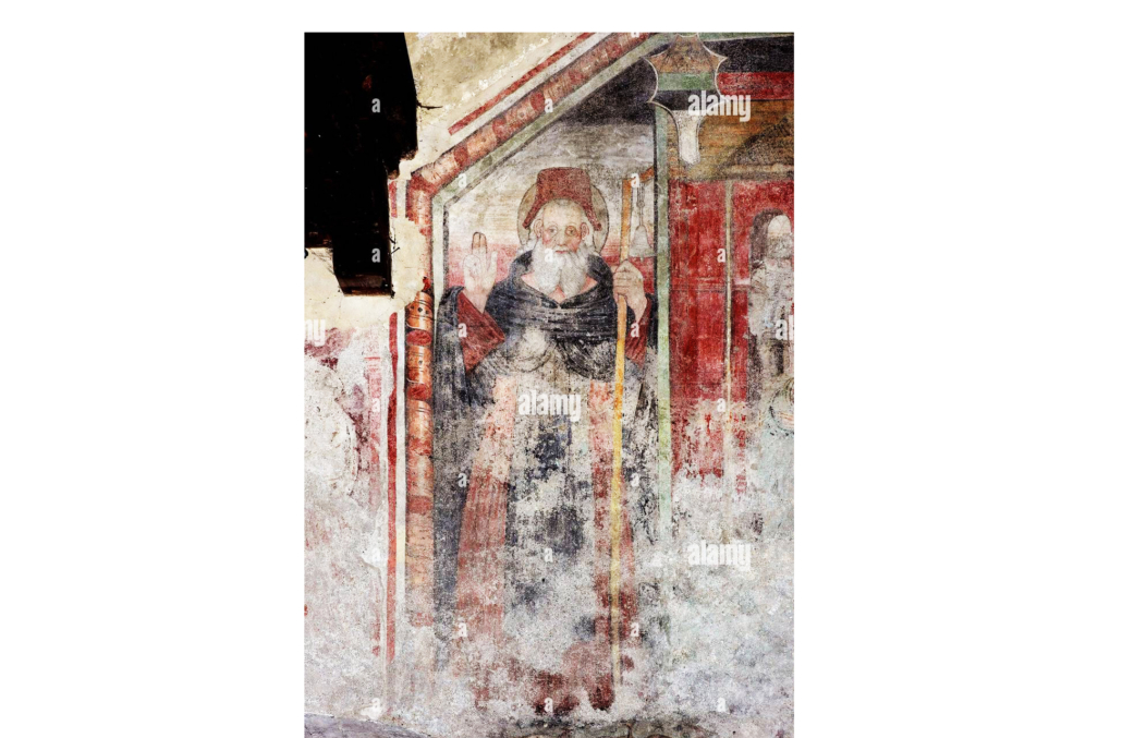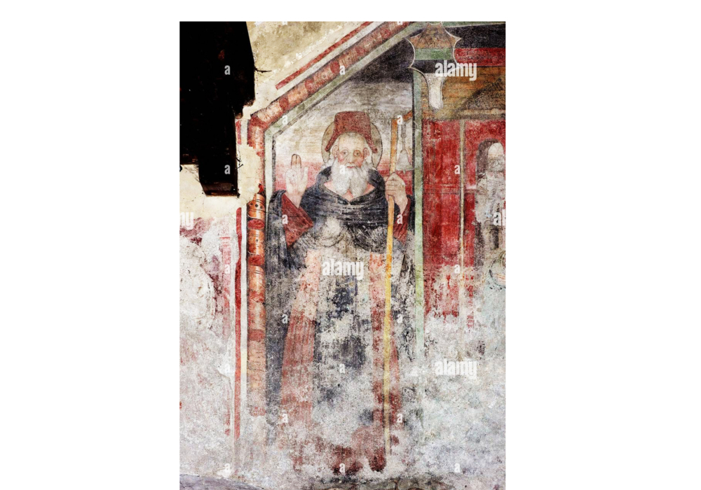 Tra essi un affresco con la figura di sant’Antonio abate con la mano destra nel gesto di benedizione e la sinistra che regge un bastone a “L” da cui pende una campanella.