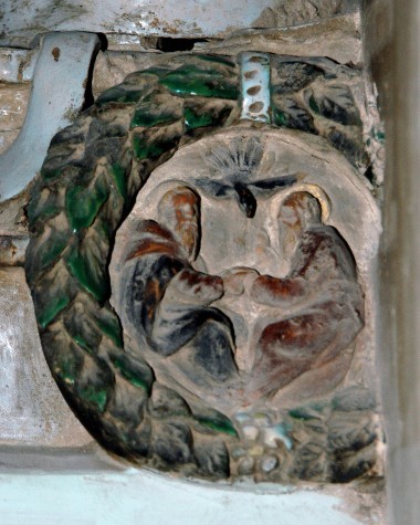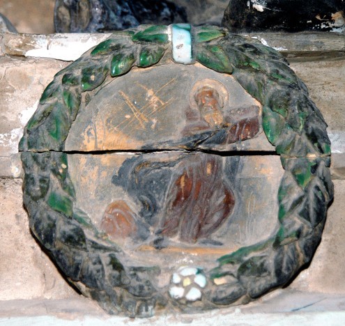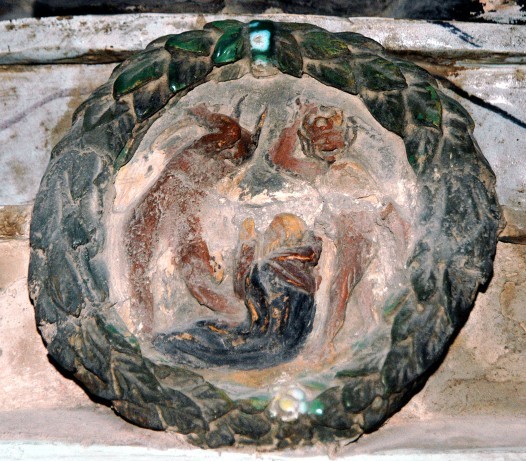 Sotto la statua tre tondi in terracotta invetriata del diametro di 20 cm, dello stesso autore, che raffigurano: