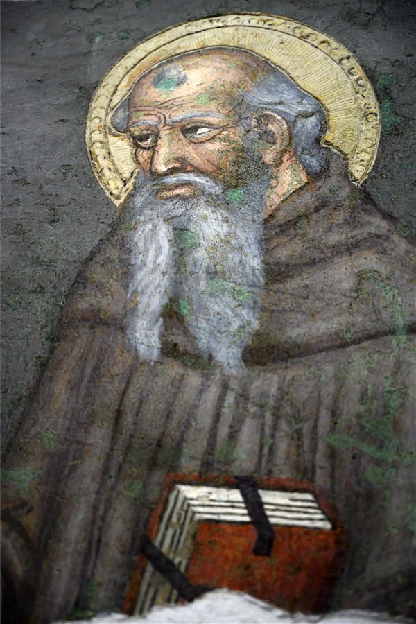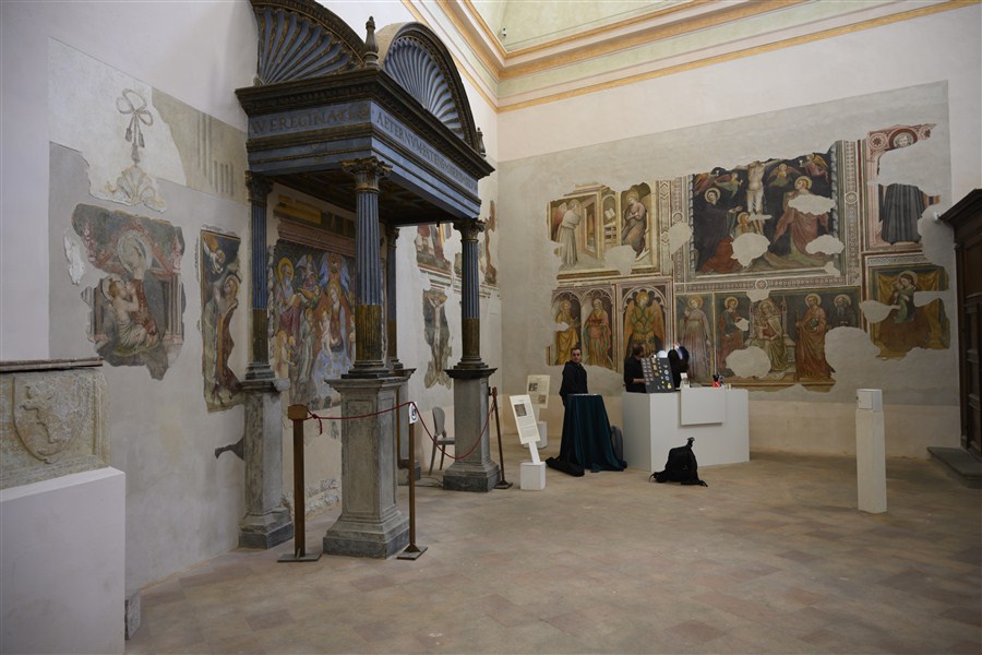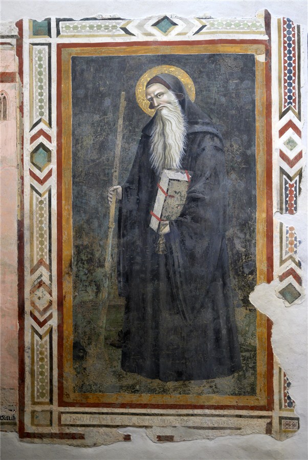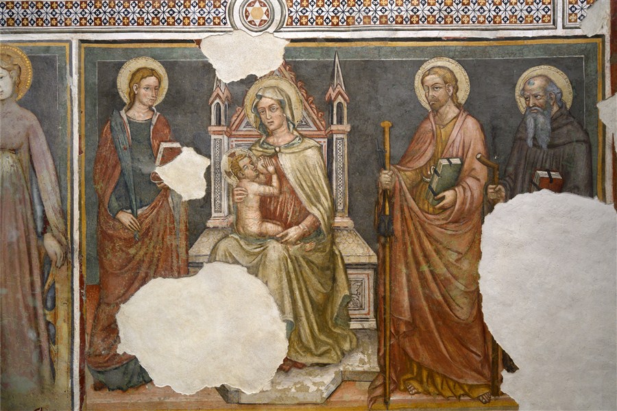 GUBBIO (PG). Ex Chiesa di Santa Maria Nuova, due affreschi di s. Antonio abate e immagine dalla “Madonna del Belvedere” di O. Nelli