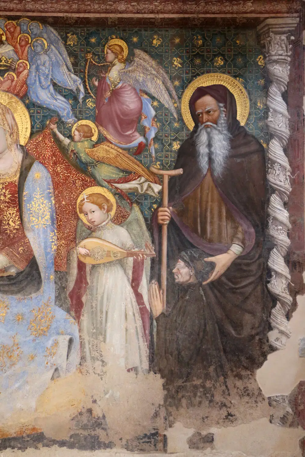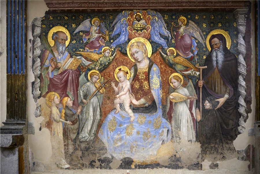 Segue una Maestà con la Madonna in trono che allatta il Bambino tra i Santi Giovanni Evangelista, Giacomo Maggiore e Antonio abate, del quale purtroppo rimane solo la parte superiore; il dipinto è attribuibile a Ottaviano Nelli. Sant’ Antonio abate ha una lunga barba bianca biforcata, tiene un bastone con terminazione a “L” con la mano destra e un libro con la sinistra.