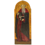 Il Santo, con saio, mantello e barba biforcata, tiene con la mano destra un bastone a stampella e appoggia la sinistra sul capo del committente.
