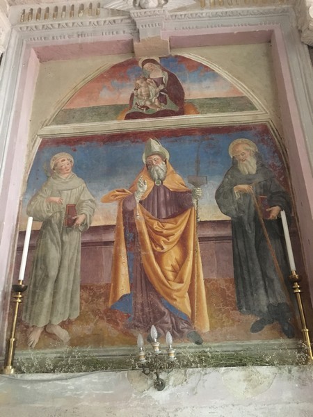 Un affresco del 1515, opera dell’artista aquilano Saturnino Gatti (1463 circa – 1518 circa), raffigura la Madonna col Bambino (in alto) e (in basso da sinistra) i santi Francesco (?), Nicola e Antonio abate. Sant’Antonio, a destra, è raffigurato con: saio scuro, barba bianca, bastone nella mano destra e libro nella sinistra.