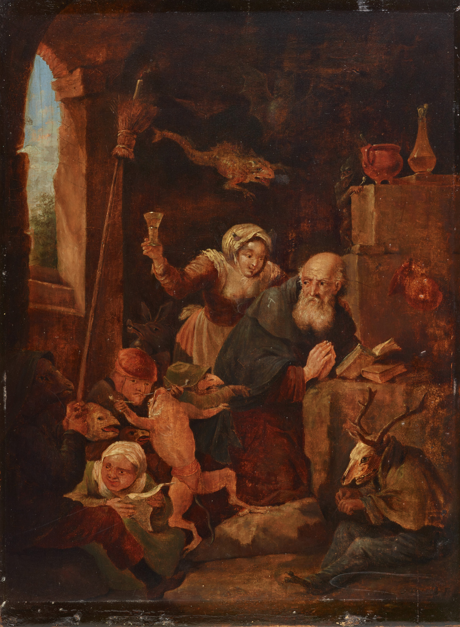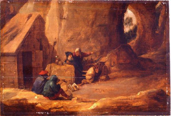 Il monogramma “DtF” sulla traversa della porta della capanna è apocrifo. Il dipinto infatti non è opera originale di David Teniers il Giovane, come vorrebbe il catalogo Belgiojoso, bensì una copia della “Tentazione di Sant’Antonio” che del maestro fiammingo si conserva a Colonia, nel Wallraf Richartz-Museum. Di Teniers si conservano molte versioni di questo soggetto, spesso declinato in chiave paesaggistica, come nel caso del dipinto di Colonia, dove la scena centrale è inserita in un contesto di ampio respiro spaziale, con l’antro roccioso dietro cui si apre, a sinistra, una porzione di paesaggio alberato che si perde all’orizzonte. Nella tavola del Castello lo sfondo paesaggistico viene eliminato ed il punto di vista ravvicinato.
