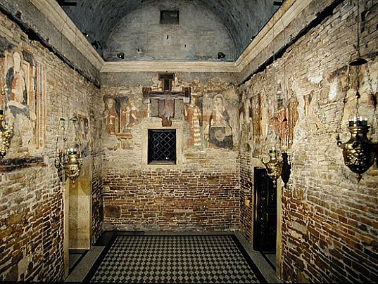 Nel sacello, sulla pareti della Casa di Maria sono state affrescate nel XIV-XV secolo sei raffigurazioni della Madonna seduta con il Bambino e la relazione Madre – Bambino è resa in maniera diversa.