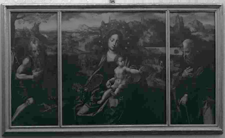 Trittico di 128 x 2221 cm, raffigurante Madonna col Bambino e i Santi Girolamo e Antonio abate.