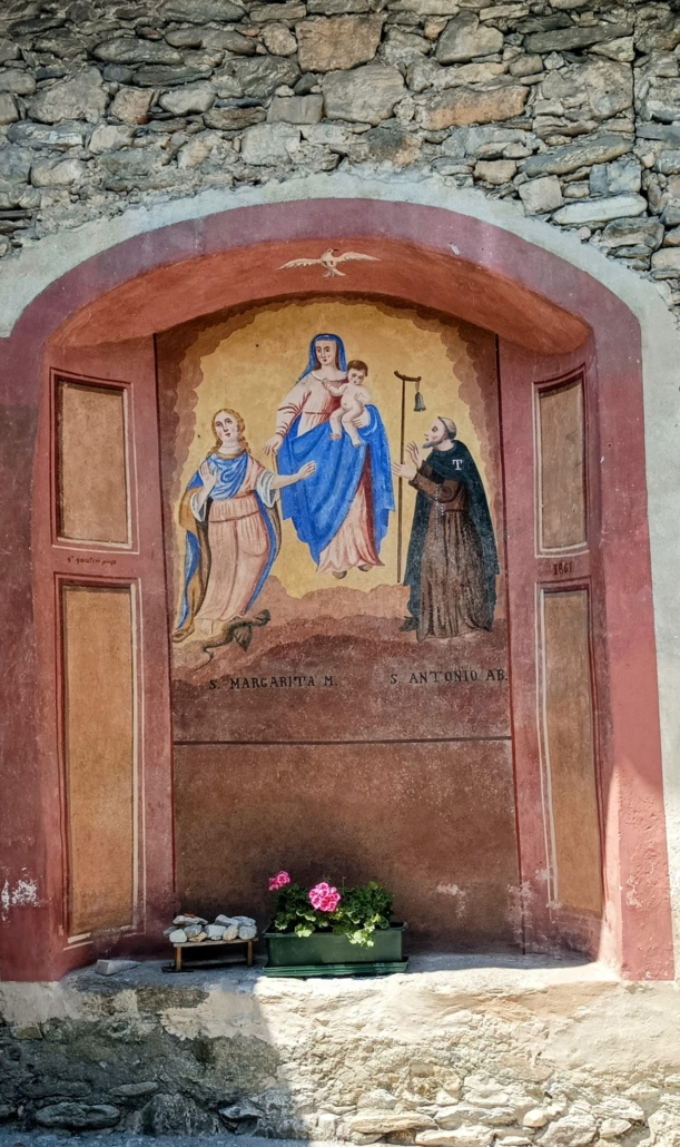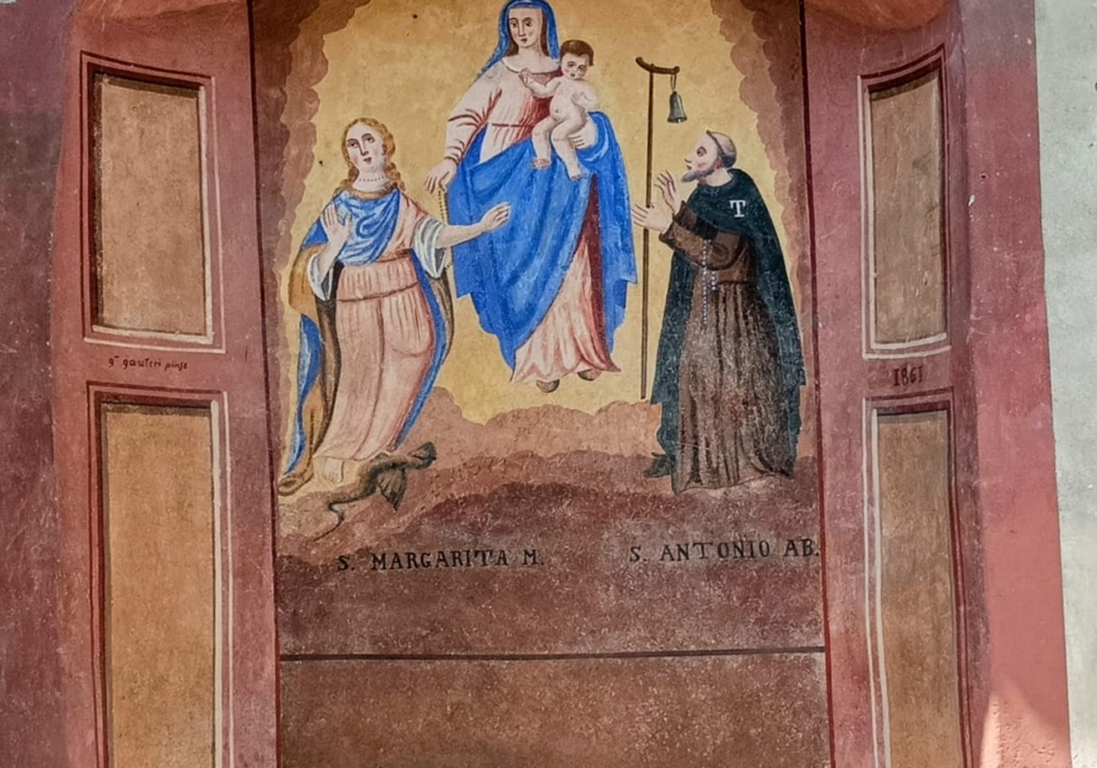 Nel Paese vi è un’edicola è affrescata con la Madonna col Bambino e in basso a sinistra santa Margherita e a destra sant’Antonio abate con la tau sul mantello e nelle mani un bastone cui è appesa una campanella.