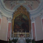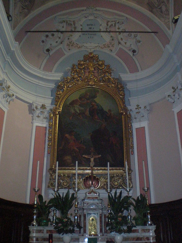 Sull‘altare maggiore è posta una grande ed elaborata cornice che racchiude il dipinto del 1763 di Francesco Savanni (1724 – 1772): Incoronazione della Vergine con san Giovanni Battista, sant’Antonio abate e san Lorenzo.