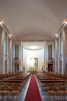L’impianto compositivo rispetta pienamente il tipo basilicale, ma ne semplifica gli elementi architettonici secondo i canoni del razionalismo. All’interno le pareti laterali sono caratterizzate da un ritmo serrato di pilastri, tra i quali si alternano stilizzate edicole rettangolari e nicchie semicircolari leggermente più ampie in larghezza, a definire una scansione non priva di un certo dinamismo. Le nicchie, dotate di semplici altari lapidei su predella di un solo gradino, si sviluppano liberamente sino all’architrave, mentre le edicole sono sormontate da superfici murarie aperte al centro da snelle finestre rettangolari con vetrate policrome. L’abside semicircolare, di modeste dimensioni, comunica direttamente con la sacrestia posizionata alla sua sinistra, a sua volta collegata ai locali parrocchiali.