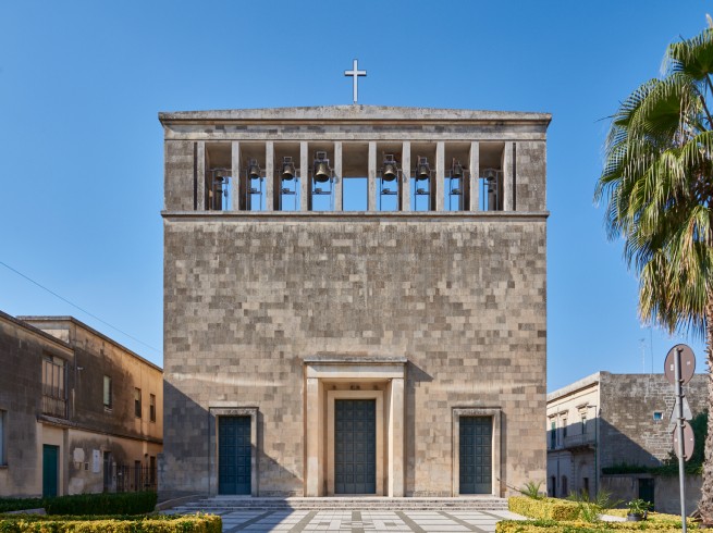 La facciata, piuttosto semplice, è coronata in alto da una teoria di celle campanarie che si estendono lungo tutta la larghezza del prospetto, e svettando al di sopra del piano di copertura ripropongono uno schema architettonico antico. L’ampio portale centrale è fiancheggiato da due ingressi minori, e nell’apparente spessore della facciata si inseriscono, simmetricamente disposti, due vani di servizio e due vani scala che conducono al piano di copertura e alla cantoria ricavata sulla controfacciata. Il sagrato, sopraelevato di alcuni gradini, è delimitato a sinistra dal corpo di fabbrica dell’oratorio del Sacro Cuore.