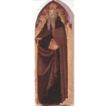 Sant’Antonio abate è raffigurato a sinistra, stante, mentre sta leggendo un libro che tiene con la mano sinistra, con la destra si appoggia al bastone a Tau; ai suoi piedi a sinistra le fiamme e a destra la campanella. Sullo sfondo, tra i santi Antonio e Valentino, ci sono vari animali.