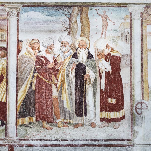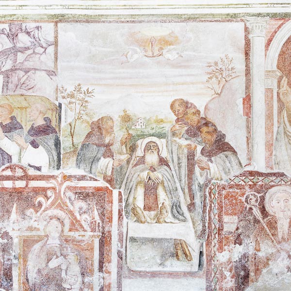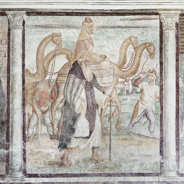 – 12 riquadri sono attribuiti, per le figure, a Giovanni da Mel o Giovanni Rosso (Tai di Cadore, circa 1480 – Belluno, 1549), con l’apporto del fratello Marco (la natura che fa da sfondo) dipinti negli anni 1520-30. Questi sono leggibili su più piani perché ciascuno narra molteplici episodi della vita del Santo.