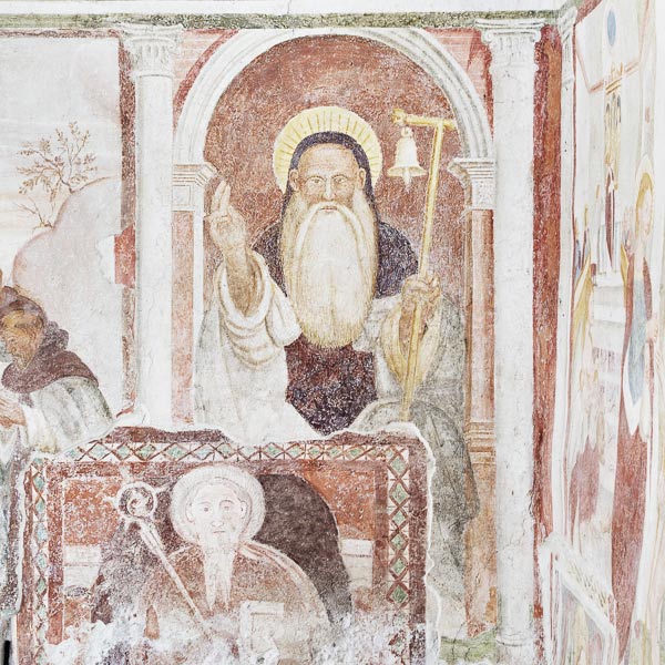 L’aula presenta uno dei più completi ed interessanti cicli di affreschi del bellunese che narrano episodi della vita di S. Antonio abate in 18 riquadri.