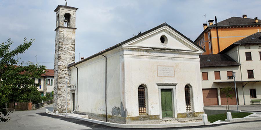 L’edificio, il cui nucleo originario risale al primo Quattrocento, ingloba preesistenze tardo medievali, anch’esse affrescate: nell’attuale abside, dalle scalette dietro l’altare, si scende all’antico livello del pavimento e tra gli affreschi tardo medioevali spicca per ricchezza cromatica la “Madonna che allatta” del secolo XV.