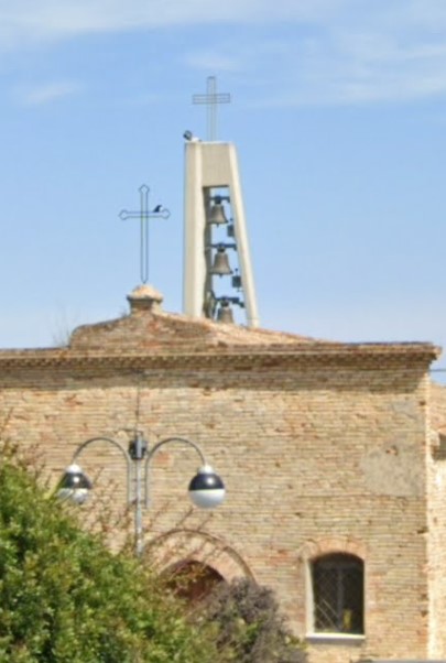La torre campanaria, recente, realizzata con due pareti ortogonali rastremate in cemento armato e posta su