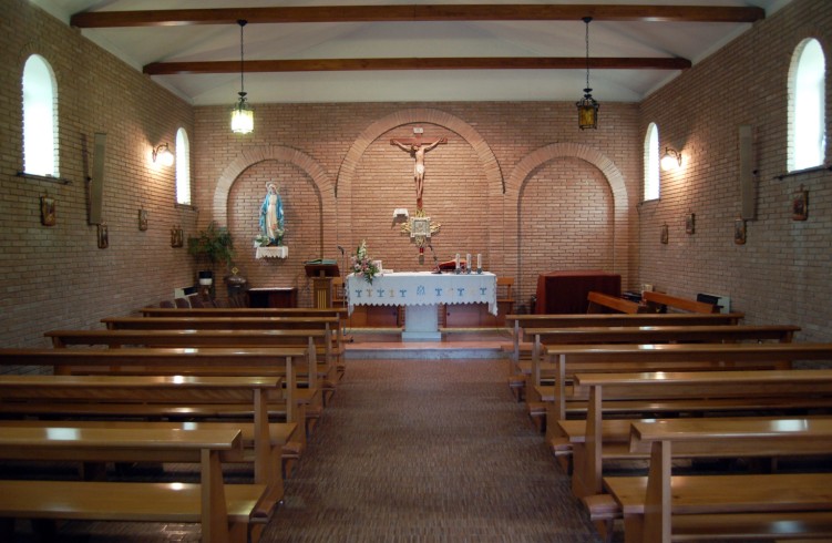 La chiesa ha un impianto ad aula coperta da due falde inclinate scandite con finte travi in legno; le pareti sono interamente rivestite con mattoni a vista che compongono un disegno ad archi ciechi nella parete del coro.