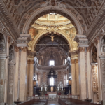 La navata centrale della chiesa è coperta da una volta a botte a cassettoni, adornata con raffigurazioni di santi le cui spoglie dovrebbero essere conservate all’interno della chiesa; le due navate laterali, divise da pilastri, presentano volte a cupola suddivise in eleganti riquadri.
