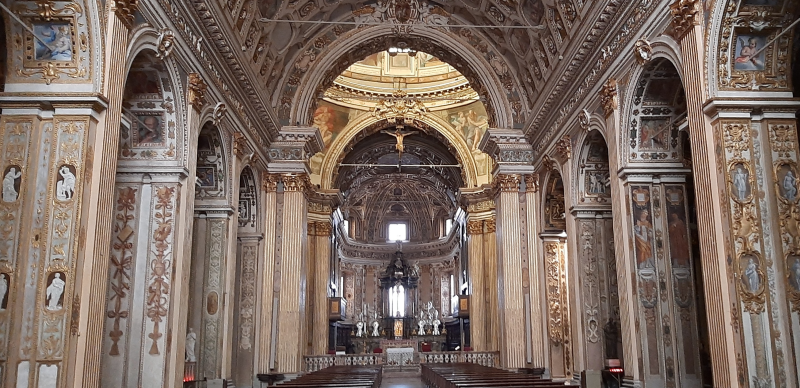 L’interno della chiesa è a croce latina, a tre navate e sei arcate per lato, separate da pilastri rettangolari con lesene corinzie decorate a vari motivi, con una struttura che richiama in scala minore San Pietro in Vaticano, avendo un asse maggiore della lunghezza di settanta metri. Gli interni si caratterizzano per la separazione strutturale della zona del transetto e dell’abside da quella delle tre navate antistanti per la presenza di una cupola, sorretta da quattro grossi pilastri.