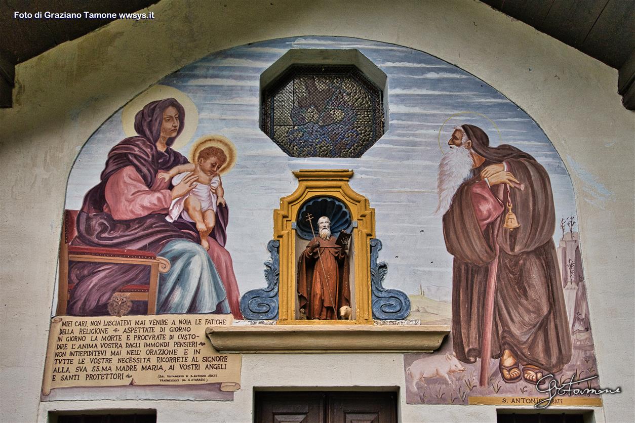 La facciata conserva in una nicchia la antica statuetta del Santo (con ai piedi il maialino). Il grande affresco realizzato nel 1979 presenta, a sinistra, la Madonna con il Bambino e a destra la figura di sant’Antonio abate, con bastone a Tau e campanella e ai piedi un maiale.