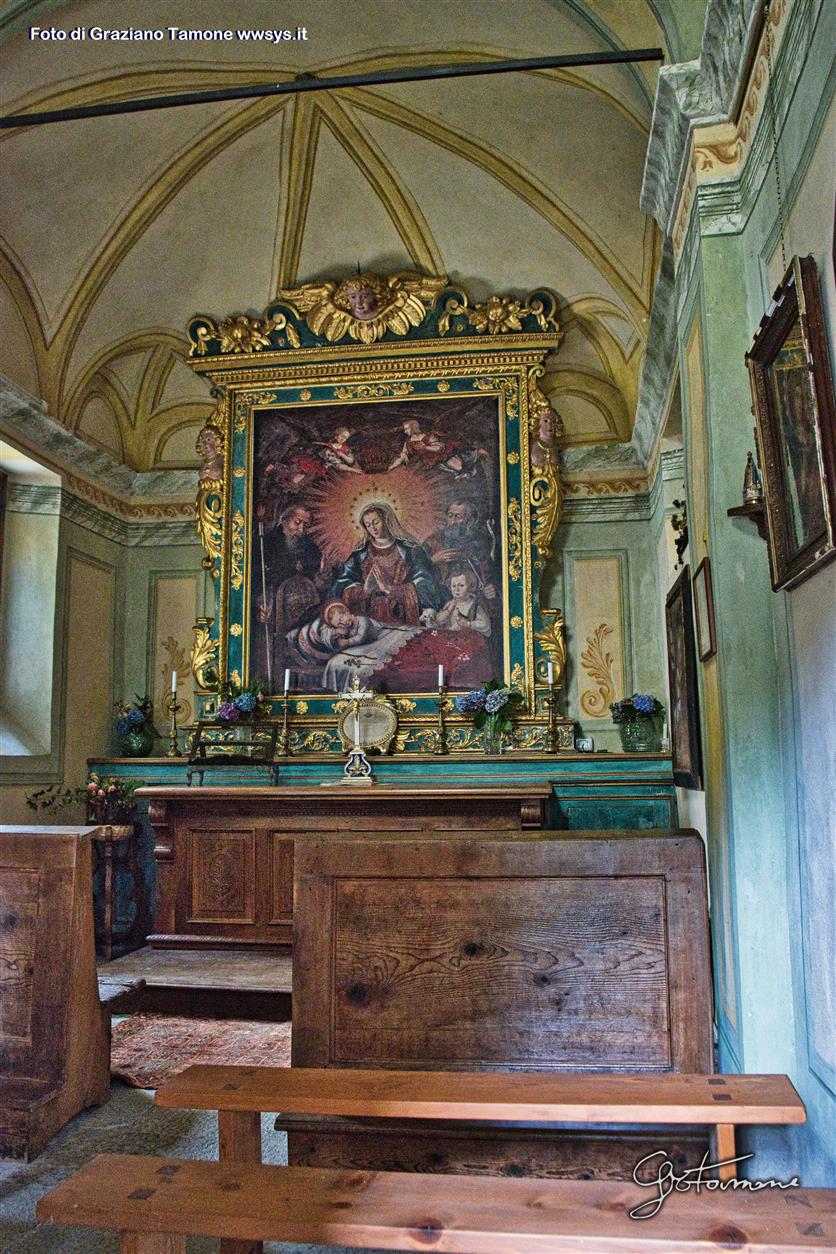 All’interno dell’Oratorio, c’è una graziosa acquasantiera in pietra e, sull’altare, un grande dipinto che raffigura la Madonna incoronata da angeli che veglia sul Bambino dormiente, con san Giovannino, san Pietro (a destra) e sant’Antonio abate (a sinistra).