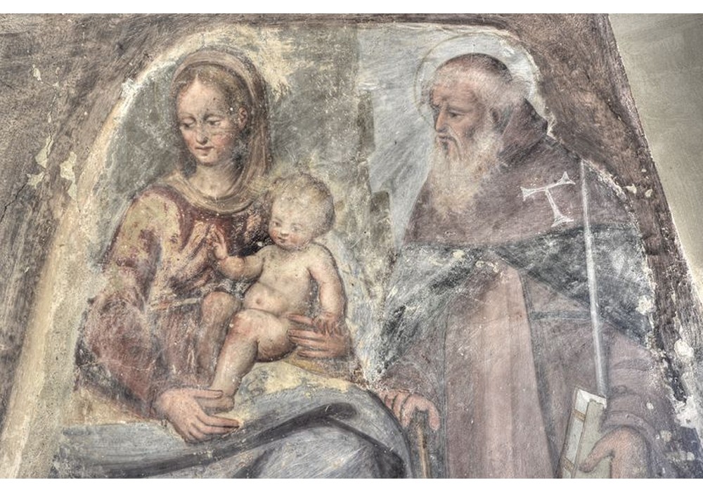 Affresco, datato 1661, che rappresenta la Vergine e Sant’Antonio Abate: è stato recentemente scoperto che proprio nel corso del Seicento il luogo era abitato da alcuni eremiti, probabilmente devoti al Santo.