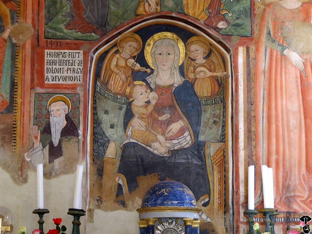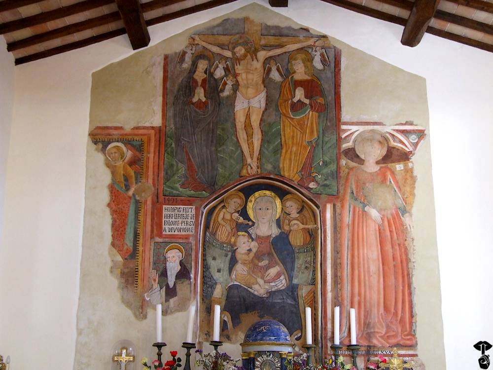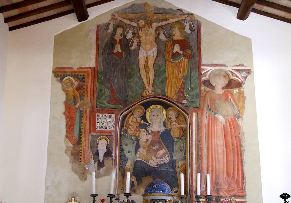Sulla parete di fondo fu realizzato un affresco riconducibile all’arte umbro-marchigiana della metà del XV secolo. Raffigura in alto una Crocifissione; in basso una Madonna del latte e figure di Santi tra cui s. Antonio abate.
