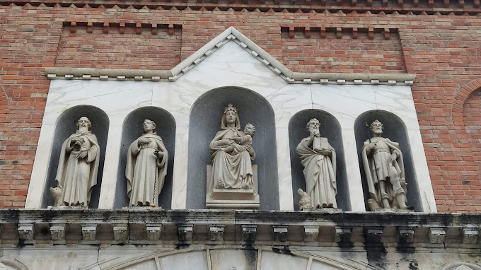 Sulla facciata principale vi sono cinque nicchie, dove campeggiano le statue di Sant’Antonio abate a sinistra, San Leonardo, la Madonna con il Bambino, San Marco e San Rocco, realizzate nel 1962 da Piero Morseletto (Vicenza, 1887 – 1974).
