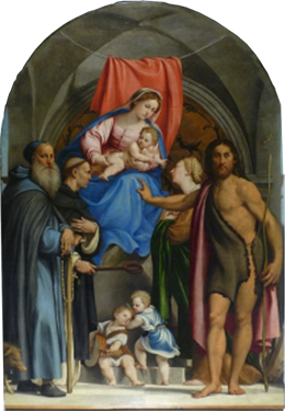 Gesù Bambino è raffigurato mentre si protende a destra verso Santa Caterina, al fianco della quale compare Giovanni Battista. A sinistra, San Leonardo, patrono della parrocchiale, e Sant’Antonio abate. Ai piedi del trono, due putti.