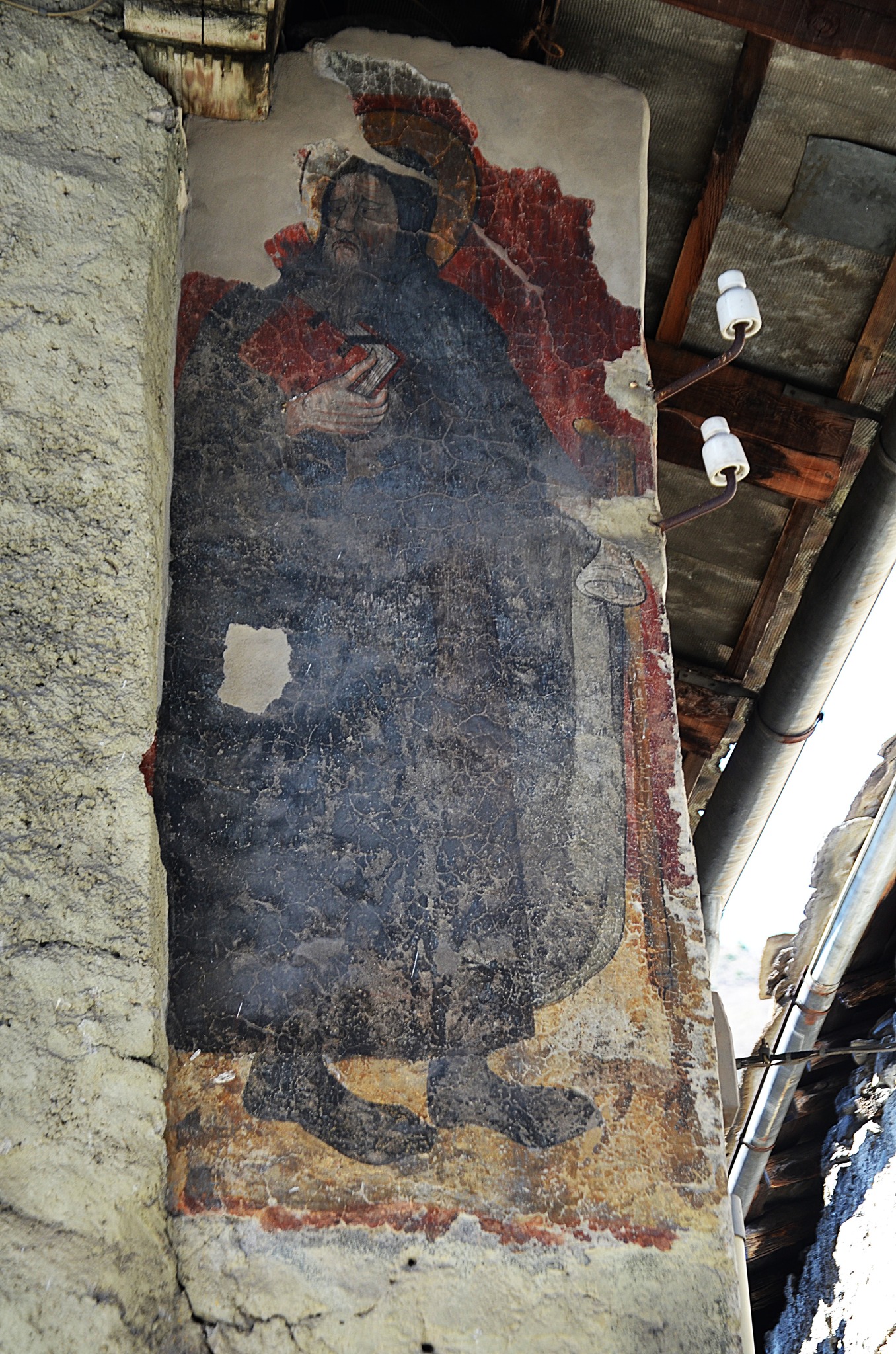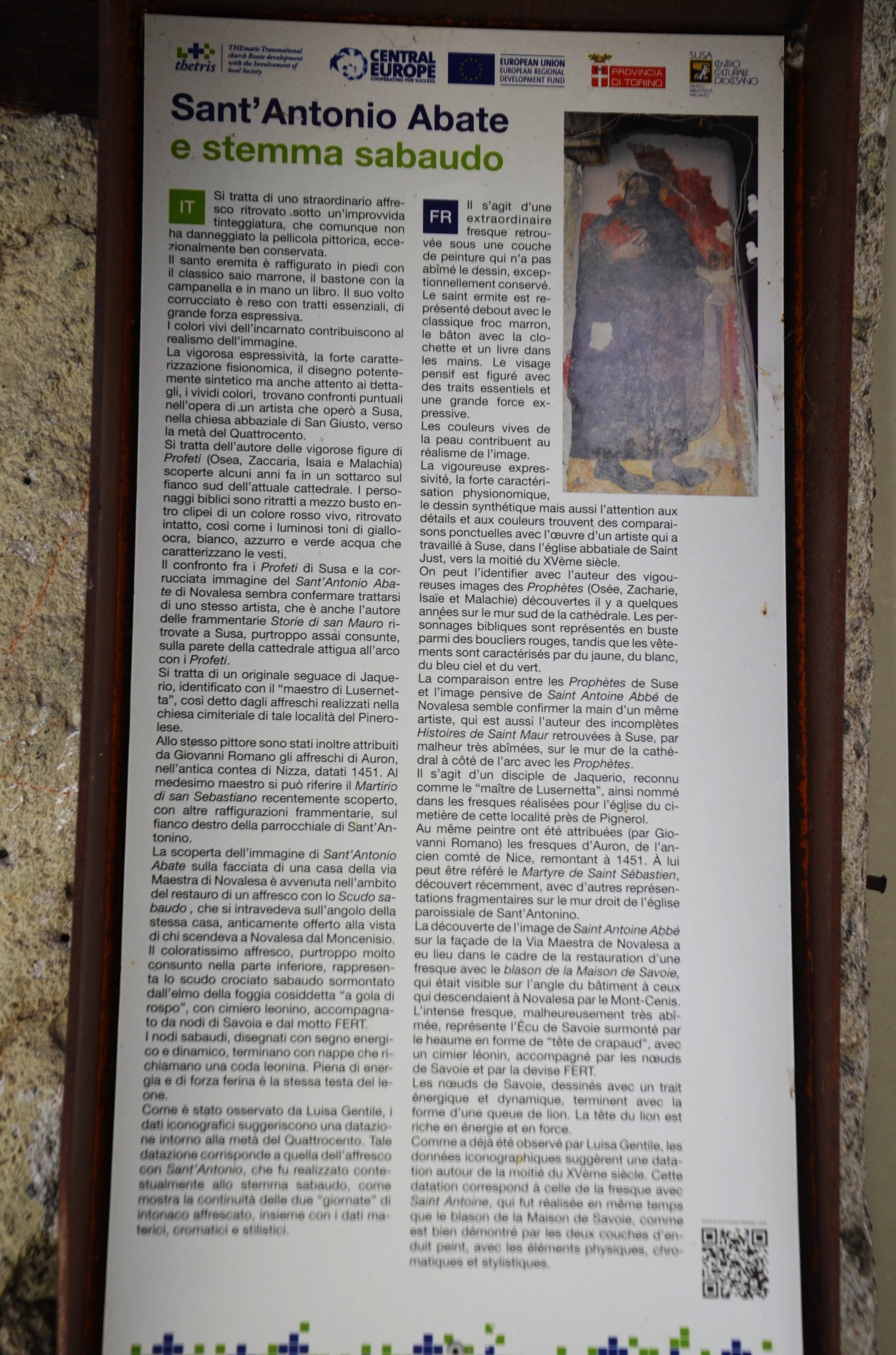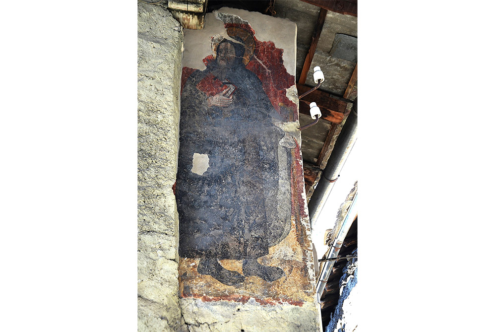 Su un angolo della facciata è comparsa anche l’immagine di S. Antonio abate, con viso corrucciato, che tiene con la mano sinistra bastone e campanella e con al destra un libro chiuso. L’affresco è attribuito al pittore che operò anche a San Giusto di Susa, un seguace di Jaquerio identificato col “Maestro della Lusernetta” che affrescò la locale Cappella di San Bernardino e datato alla metà del Quattrocento.