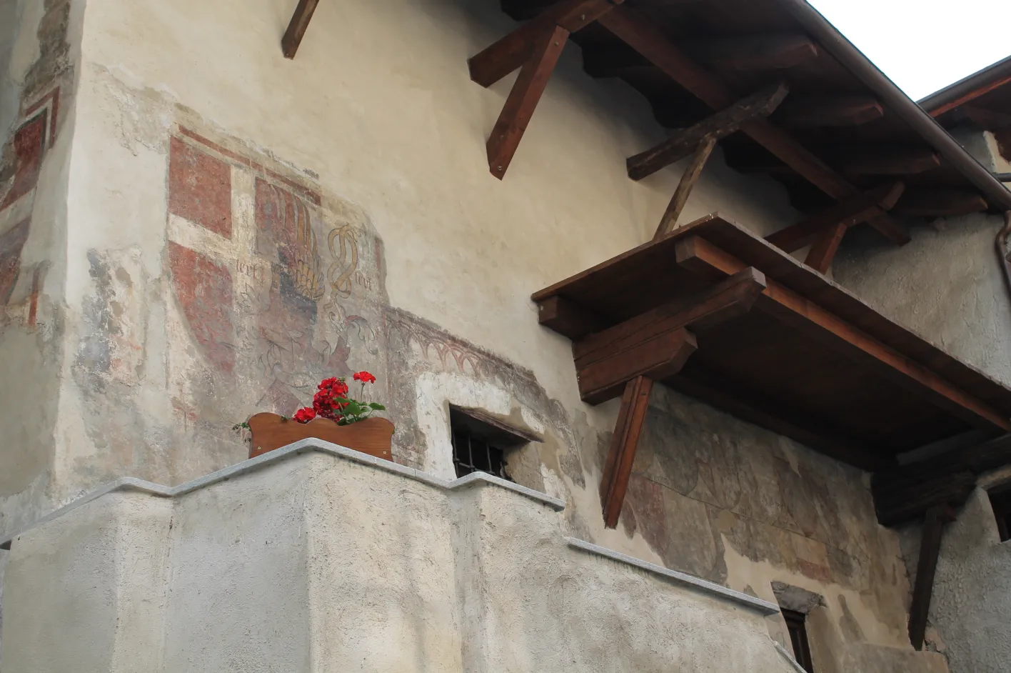 Le pitture in facciata sono riconducibili a due momenti distinti tra il Trecento e tardo Quattrocento.