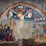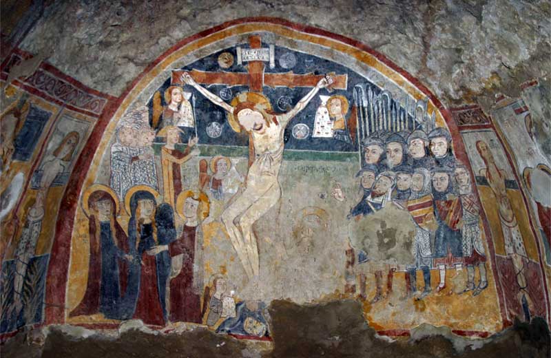 Proseguendo, sulla destra, è raffigurata la cattura di Cristo per opera di Giuda che, circondato dai soldati, stringe un cappio intorno a Gesù mentre, poco distante, Pietro taglia l’orecchio di Malco con la spada. Nel riquadro sottostante, in pessime condizioni, si può indovinare una figura che protendendo l’indice ordina a Cristo di portare la croce. Il riquadro successivo occupa in altezza l’intera parete e raffigura la flagellazione del Cristo alla colonna. Segue la raffigurazione del buon ladrone Disma, come conferma l’iscrizione, le braccia legate dietro le traverse della croce a tau, secondo un modulo iconografico comune alle scuole orientale e occidentale, derivato dalla Siria. Sulla parete di fondo della navata centrale domina, in tutta la sua ampiezza, la Crocifissione. Soldati armati si dispongono a destra di Gesù in croce mentre sulla sinistra assistono alla scena san Giovanni, Maria e un’altra figura femminile con aureola. In basso si notano appena due angeli, altri due angeli si affacciano sotto i bracci della croce, tutti intenti a raccogliere il sangue di Cristo. Sulla parete di destra, vi è per primo il cattivo ladrone Gestas, come riporta l’iscrizione, così che i ladroni sembrano affiancare la scena della Crocifissione. Gli affreschi successivi sono i più danneggiati e dunque irriconoscibili. Dalle iscrizioni ancora leggibili si può ipotizzare si tratti di una Deposizione e di una scena con le tre Marie al sepolcro.