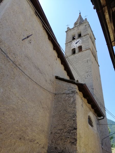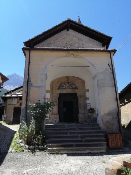 Si accede alla chiesa attraverso un massiccio portone di legno (nel 1628 fu realizzato il portone ligneo di accesso alla chiesa, firmato “M. Alferi”), intagliato secondo i modi tipici della valle e che ben si inserisce nella struttura di pietra del portale (nella prima metà del Cinquecento fu realizzato il portale lapideo, opera del lapicida Remi Fatin), che reca sull’architrave la data 1740 (data di rielaborazione del portale lapideo).