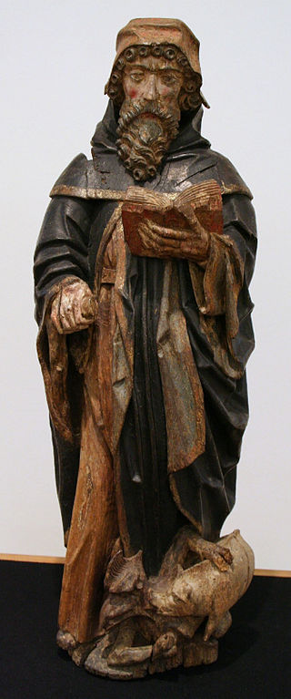 Statua di sant’Antonio abate, in legno di quercia con policromia, misura 72 x 25 x 18 cm. Realizzata nel 1520 circa dalla bottega del Maestro di Elsoo, intagliatore, scultore e artista olandese attivo dal 1510 al 1525.