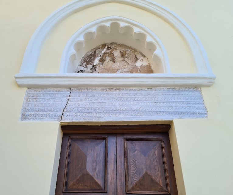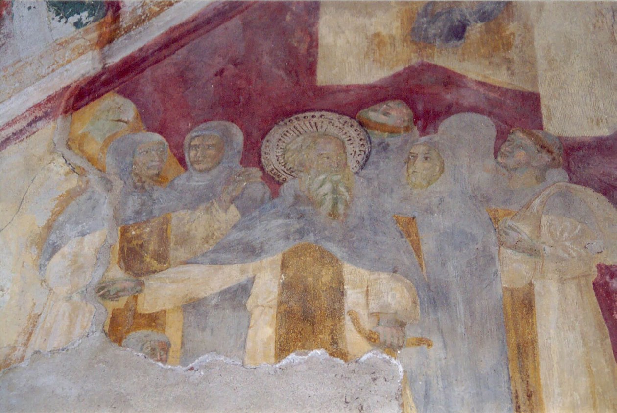 Il portale è sormontato da un’iscrizione in caratteri gotici che spiega che la cappella venne fondata per volontà di don Antonio Adecoci, arcipresbitero della chiesa di San Giovanni, dotata di un appezzamento di terra ampio più di dieci moggia in cambio di due messe settimanali per la sua anima e per quella dei propri defunti, e infine consacrata l’8 febbraio 1431. Il ciclo ad affresco doveva verosimilmente rendere omaggio al santo onomastico del fondatore e, al contempo, mettere in guardia i fedeli, che, solo seguendo l’esempio dell’eremita – rinunciando, cioè, ai beni materiali e purificandosi dai peccati commessi grazie alla confessione – potranno aspirare alla salvezza dell’anima per il tramite della preghiera.